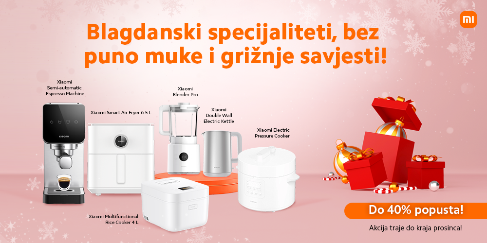 Miris cimeta, vanilin šećera, naranče ili tople čokolade neizostavni su mirisi doma u ovom periodu Božića! Pripremite svoje najdraže božićne specijalitete bez puno muke i nereda zahvaljujući Xiaomi kuhinjskim uređajima! Osim što će pomoći u pripremi, pripremit će obroke na puno zdraviji način tako da nema grižnje savjesti! Iskoristi popuste do 40% na Xiaomi Multifunctional Rice Cooker, Xiaomi Blender Pro, Xiaomi Air Fryer 6,5 l ili Xiaomi Semi-automatic Espresso Machine!